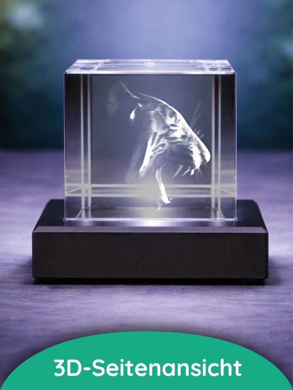 3D-Glaskristalle hingegen ermöglichen echte dreidimensionale Darstellungen – zum Beispiel von Tieren, Köpfen oder Figuren. Das Motiv scheint im Glas zu schweben und erzeugt einen starken Wow-Effekt beim Betrachter.